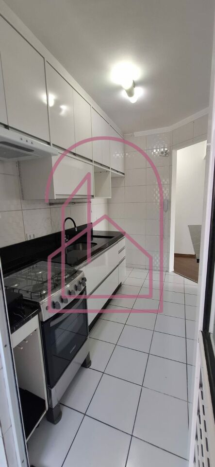 A sala é ampla para dois ambientes, bem iluminada, com lustres já instalados, integrada à cozinha americana, toda em azulejo branco, equipada com armários planejados e fogão.
