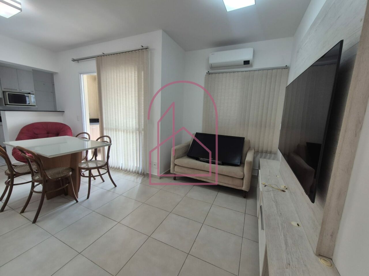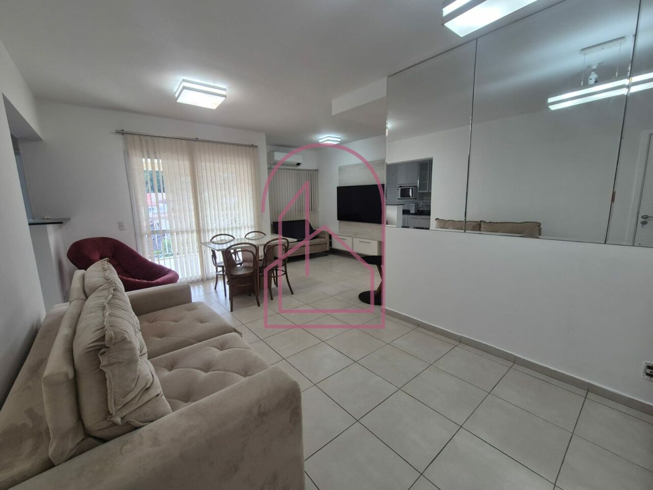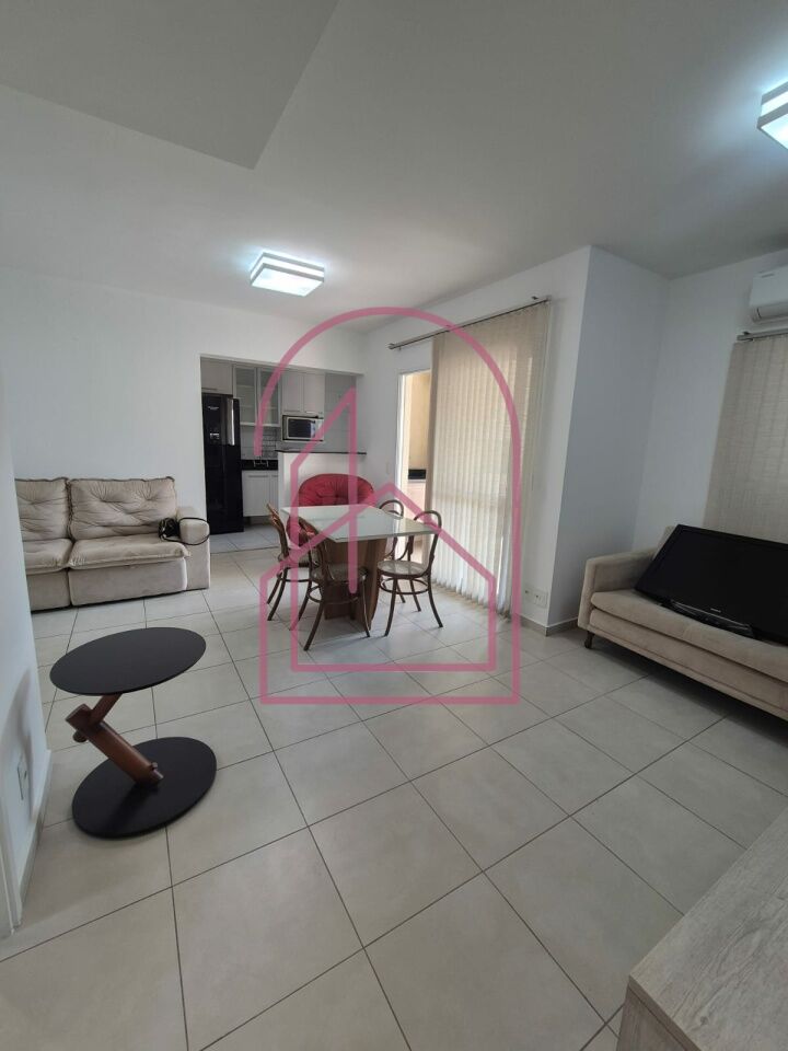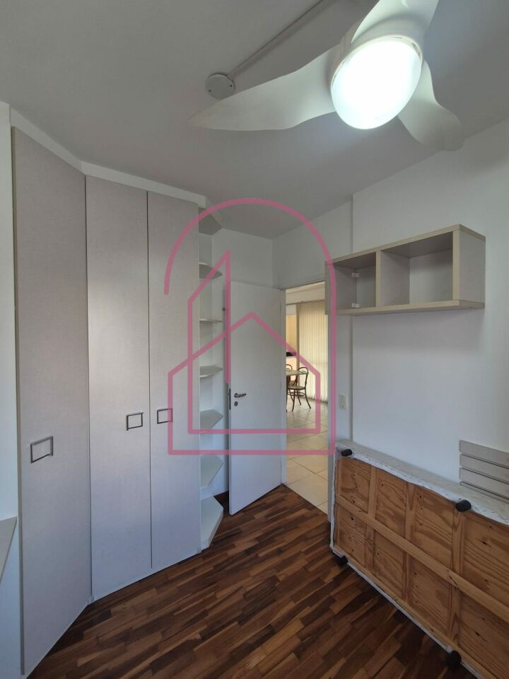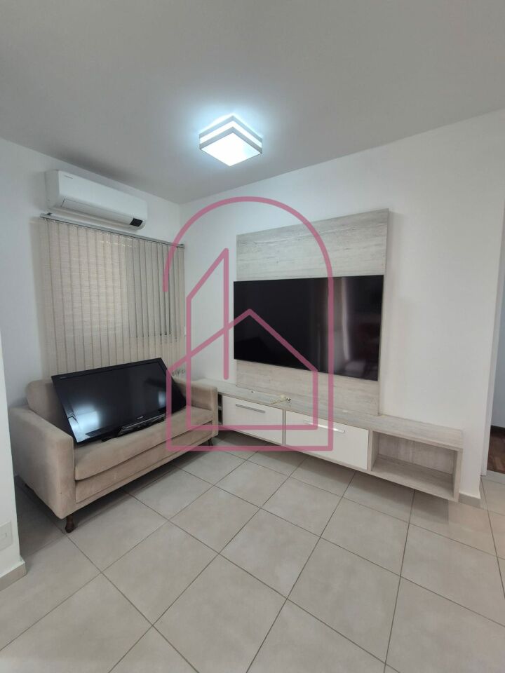 A sala é ampla e muito aconchegante, com ar condicionado, já equipada com sofá, rack e aparador (TV não inclusa). Um dos dormitórios conta com cama de casal, e o outro possui armários embutidos.