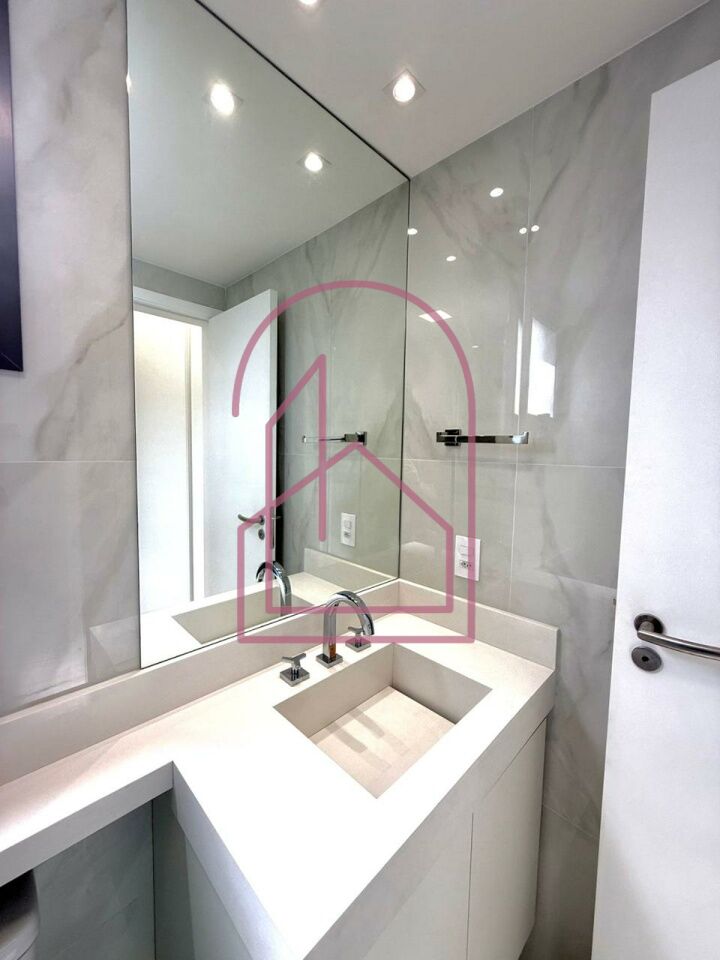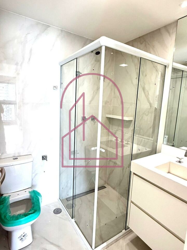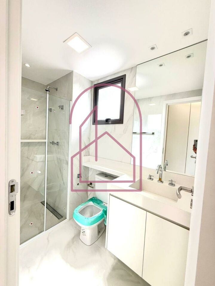 O banheiro impressiona pelo acabamento em cerâmica de alto padrão, gabinete, espelho, box de vidro e ducha, compondo um espaço moderno e refinado.