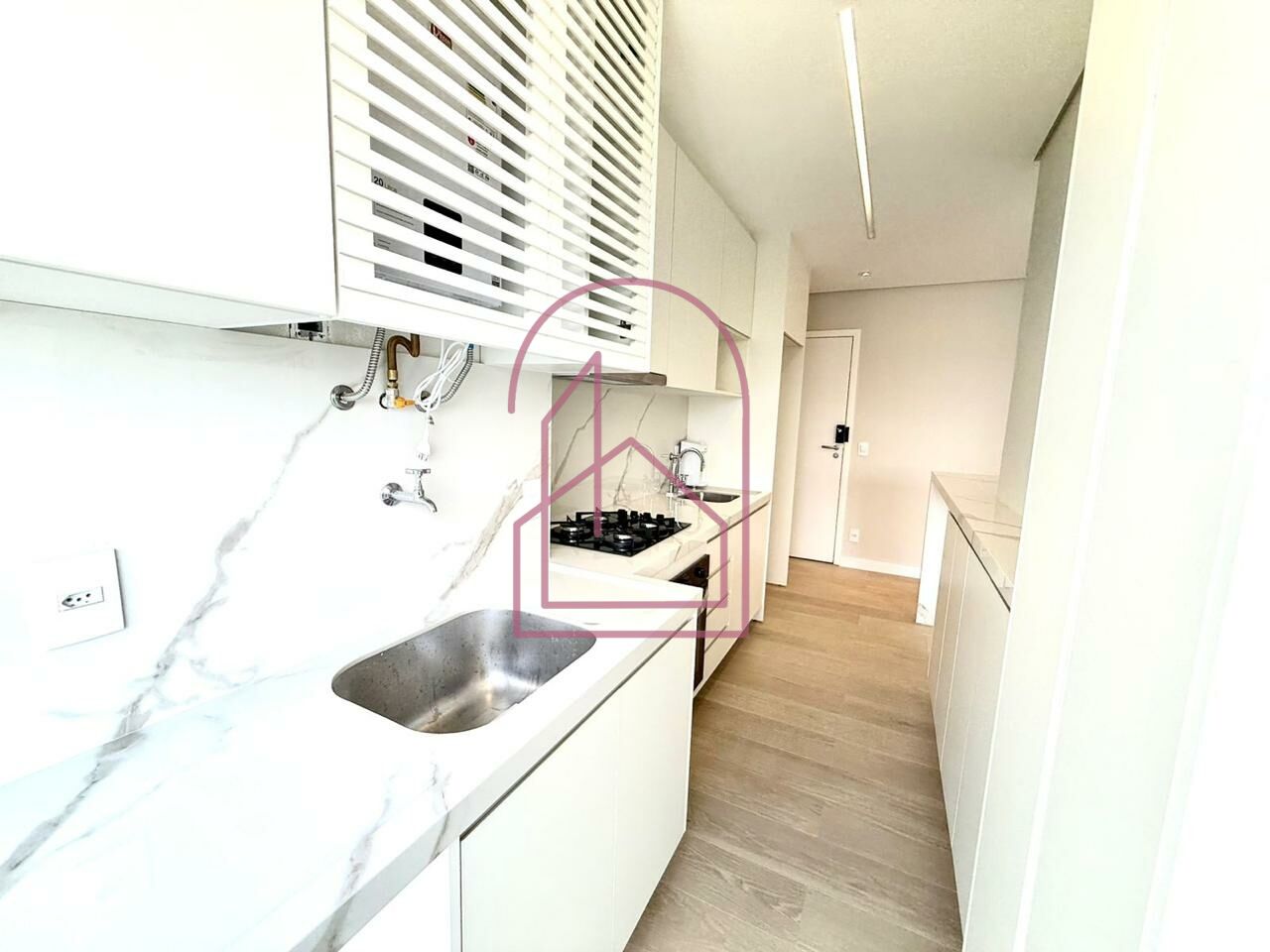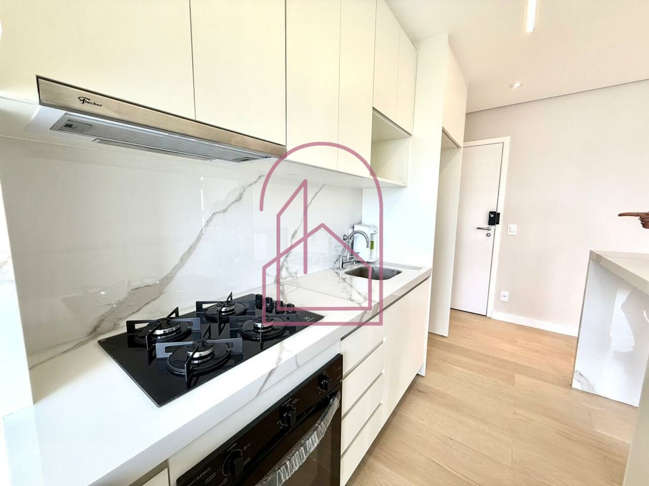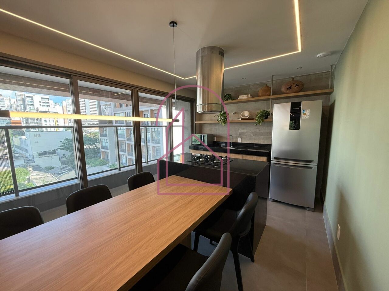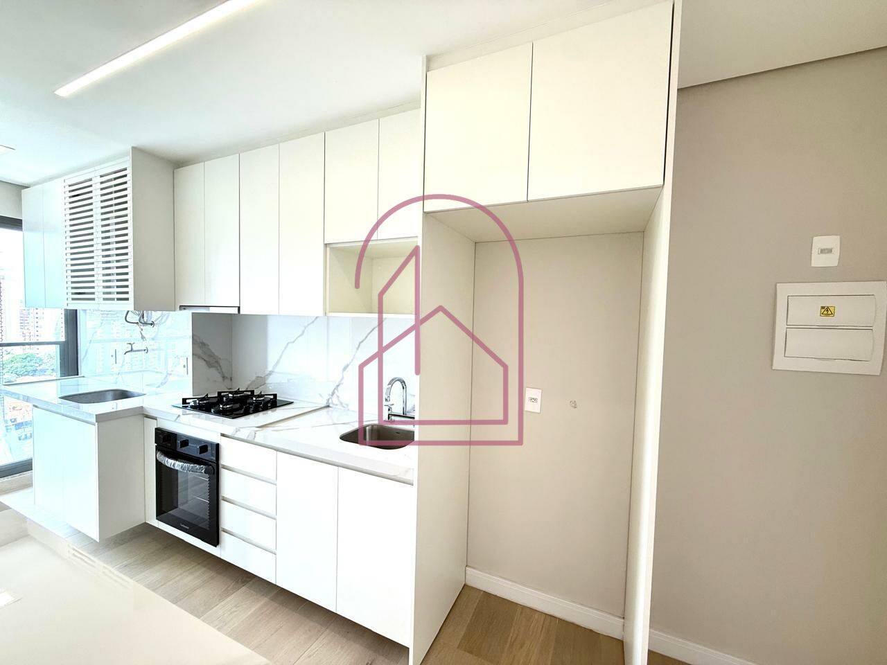 A cozinha americana integra perfeitamente os ambientes, valorizando a amplitude do espaço. Totalmente planejada, está equipada com armários embutidos, forno elétrico, cooktop e depurador, ideal para quem aprecia praticidade sem abrir mão do design.